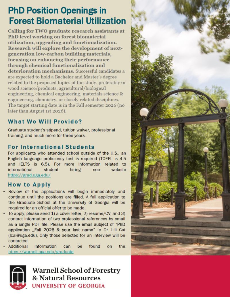 Calling for TWO graduate research assistants at PhD level working on forest biomaterial utilization, upgrading and functionalization. Research will explore the development of next-generation low-carbon building materials, focusing on enhancing their performance through chemical functionalization and deterioration mechanisms. Successful candidates a are expected to hold a Bachelor and Master's degree related to the proposed topics of the study, preferably in wood science/products, agricultural/biological engineering, chemical engineering, materials science & engineering, chemistry, or closely related disciplines. The target starting date is in the Fall semester 2026 (no later than August 1st 2026).