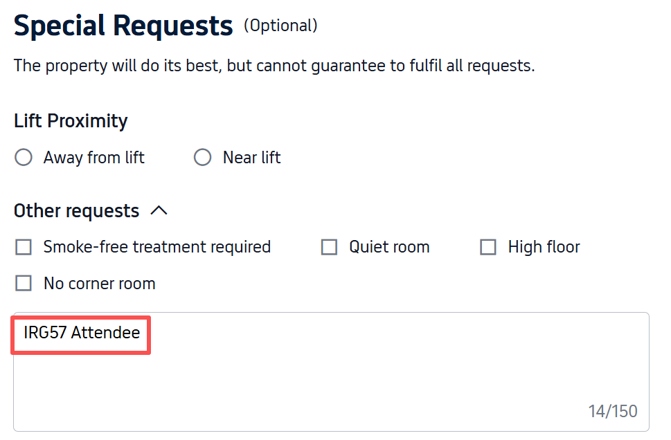 On the checkout page, scroll down to the "Special Requests" section. In the text box labeled "Additional requests", you MUST type: "IRG57 Attendee"
