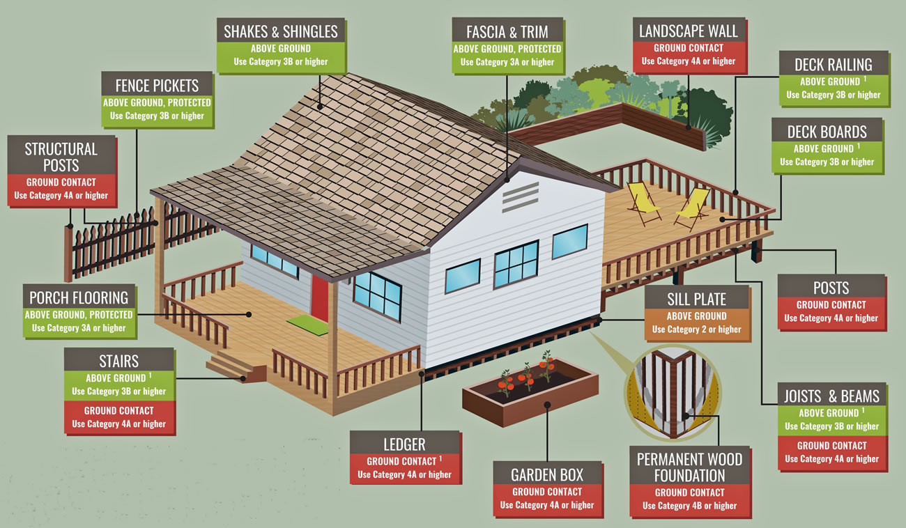 Click on the thumbnail above to view the use diagram in larger size. We thank the American Wood Protection Association for providing this image as illustrative of typical uses for preserved wood products in residential construction applications.